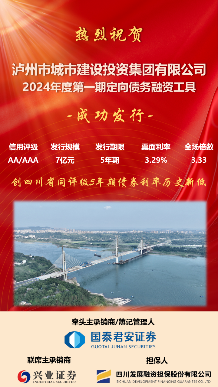 3月27日,瀘州城投集團2024年度第一期定向債務融資工具成功發(fā)行,發(fā)行金額7億元,期限5年期,票面利率3.29%,創(chuàng)四川省AA主體5年期信用債歷史新低。本期債券牽頭主承銷商為國泰君安證券,聯(lián)席承銷商為興業(yè)證券。由四川發(fā)展融資擔保股份有限公司提供增信,債項評級AAA。債券現(xiàn)已繳款完畢,當日資金已到達瀘州城投集團公司賬戶。