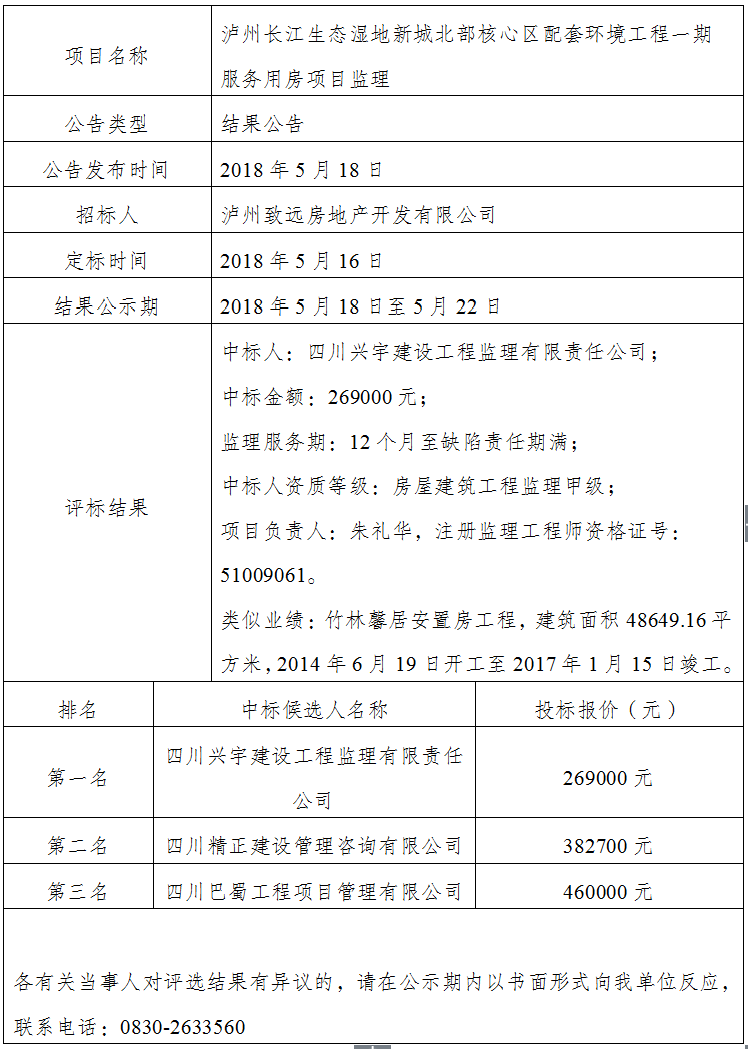 瀘州長(zhǎng)江生態(tài)濕地新城北部核心區(qū)配套環(huán)境工程一期服務(wù)用房項(xiàng)目監(jiān)理結(jié)果公告