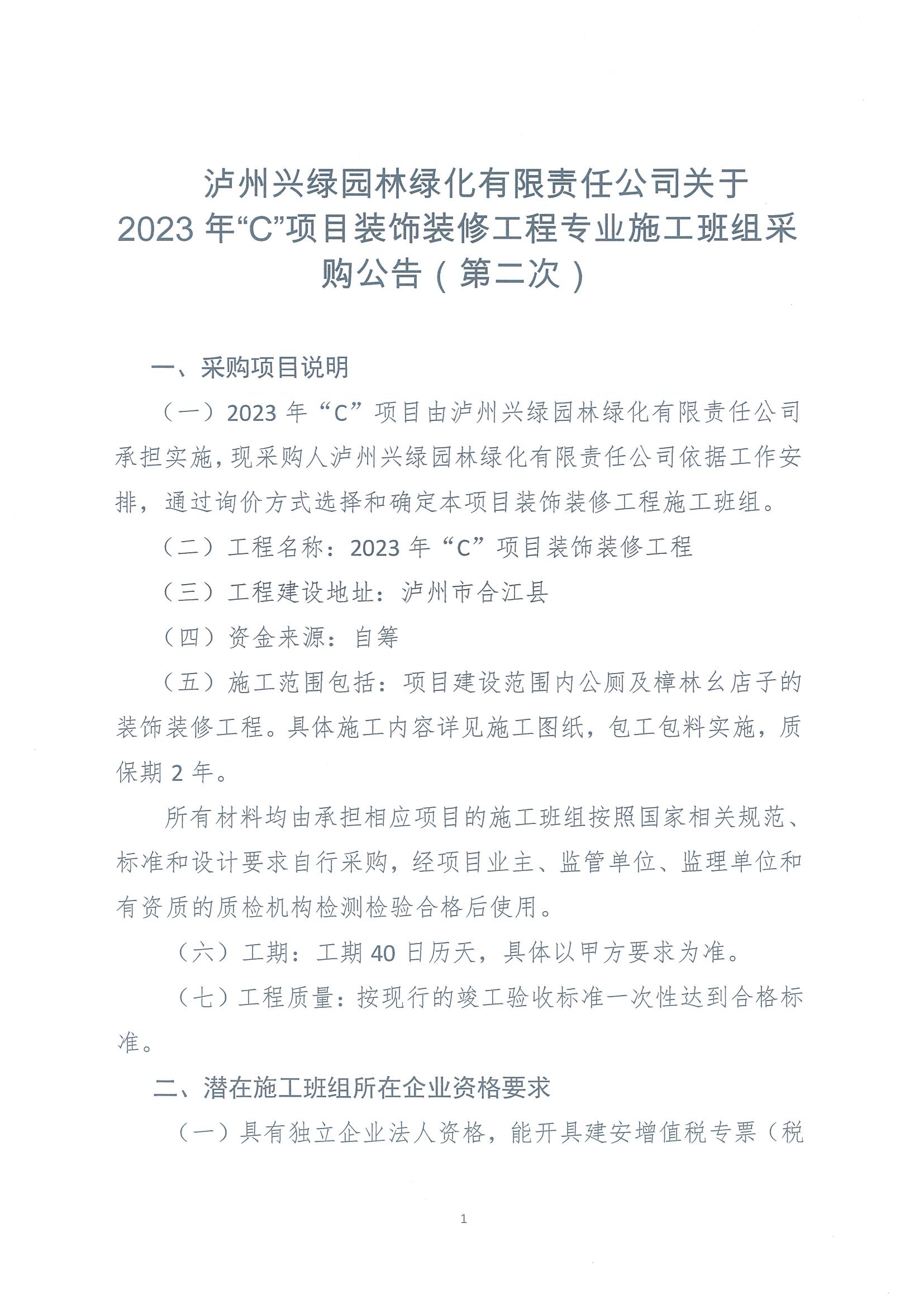 2023年“C”項(xiàng)目裝飾裝修工程專業(yè)施工班組采購公告(第二次)