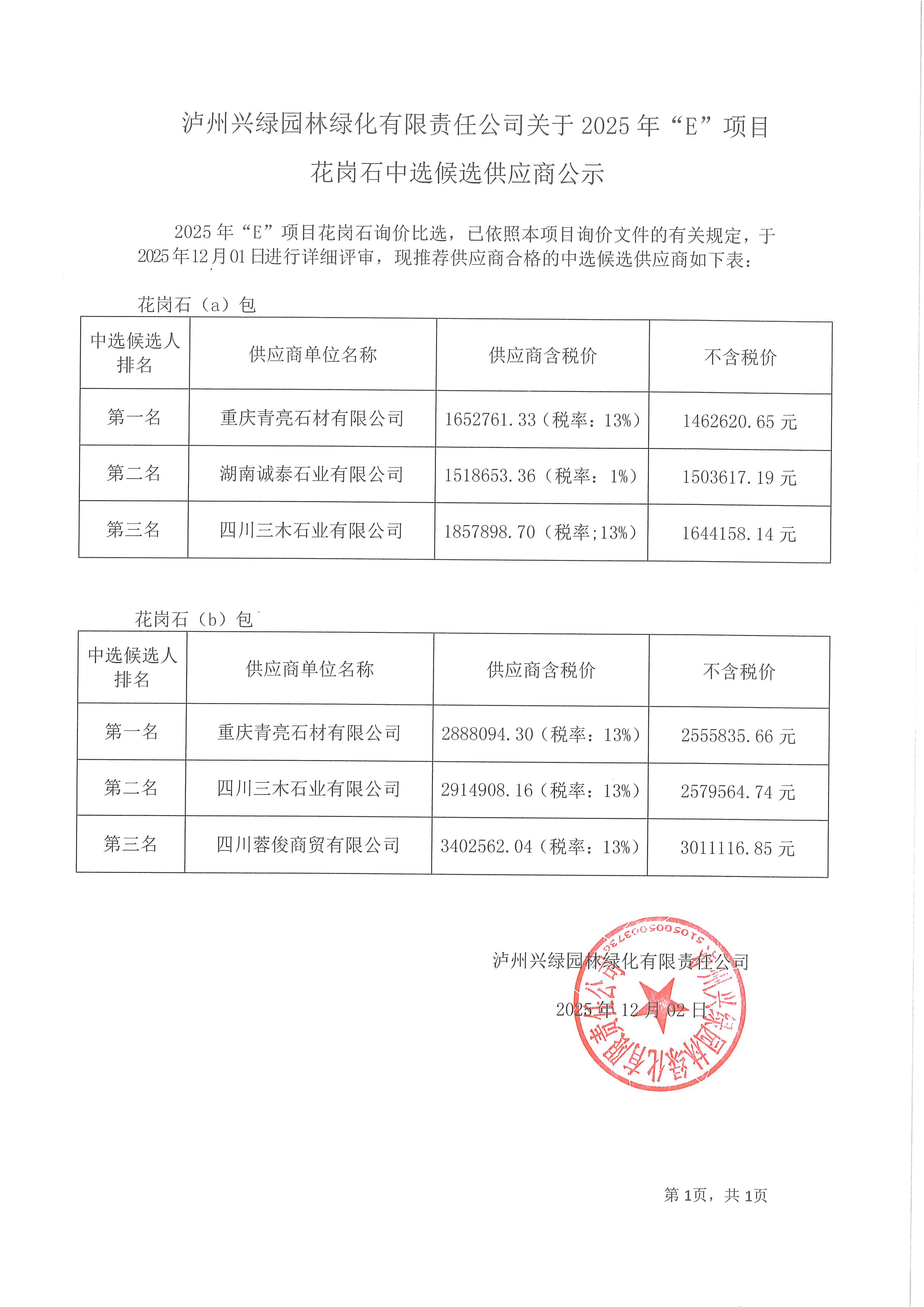 瀘州興綠園林綠化有限責(zé)任公司關(guān)于2025年“E”項(xiàng)目花崗石中選候選供應(yīng)商公示